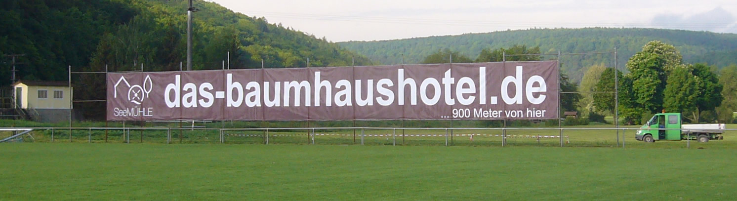 XXL-Zaunblende als Werbebanner (Mesh-Banner) angefertigt für das-Baumhaushotel.de.
