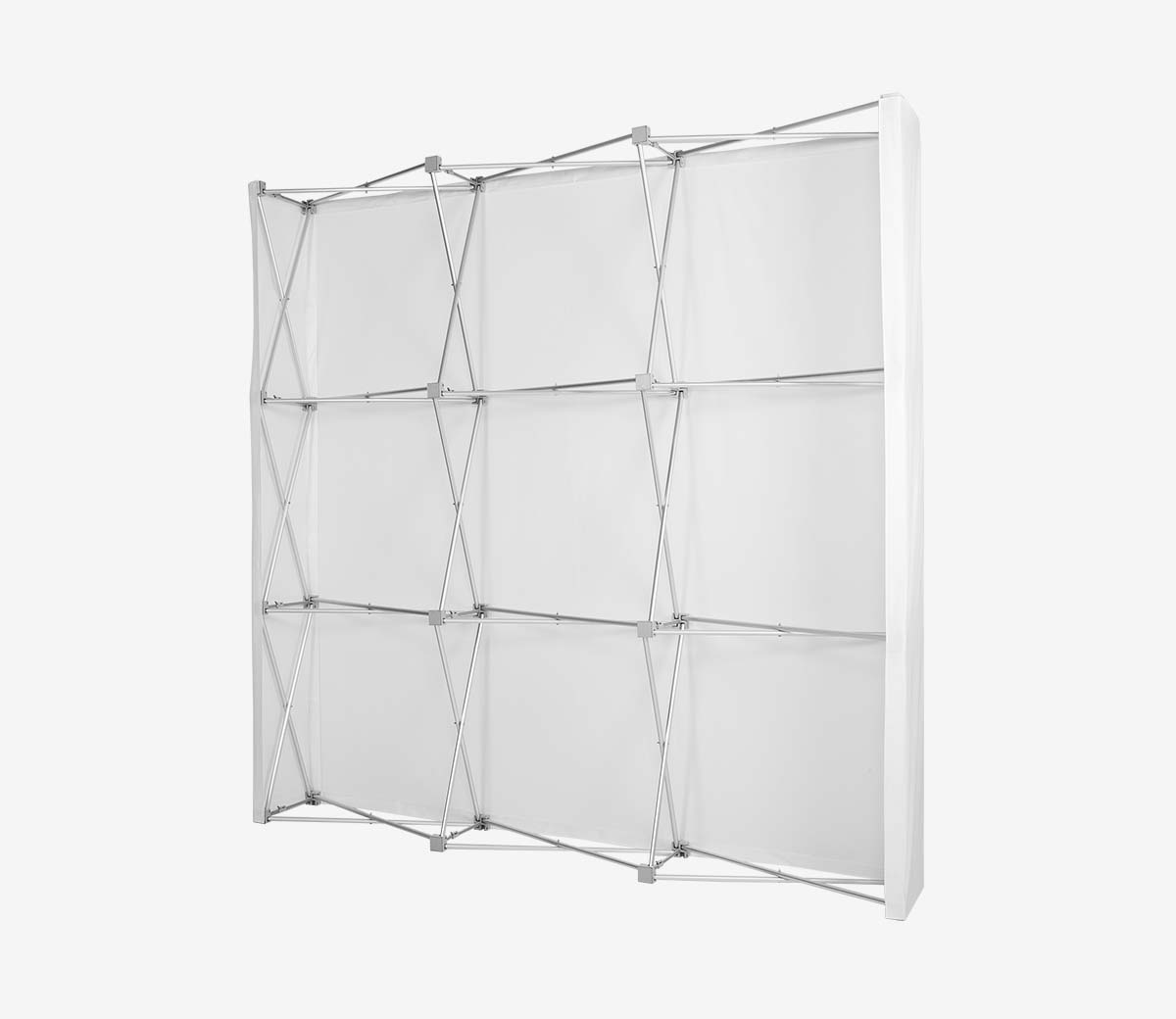 Flexibel einsetzbare freistehende Werbefaltwand inkl. Druck auf hochwertigen Displaystoff (250 g/m²) B1-zertifiziert zur Präsentation Ihrer Werbebotschaft. Das bedruckte Displaystoff wird mittels Klettverschlüssen an der Konstruktion befestigt und kann daher schnell und unkompliziert ausgetauscht werden.