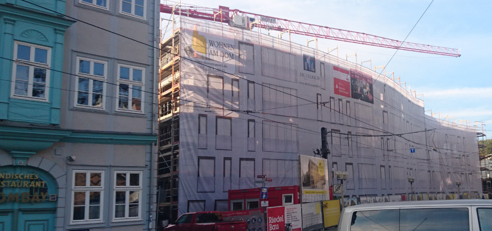 Wir drucken Gerüstbanner auch im Mega-Großformat als Sichtschutz, Werbefläche und Fassadenverkleidung bei Baumaßnahmen. Die Gerüstplane wird in großen Bahnen von maximal 5 m Breite gedruckt und zum Großflächenbanner verschweißt.